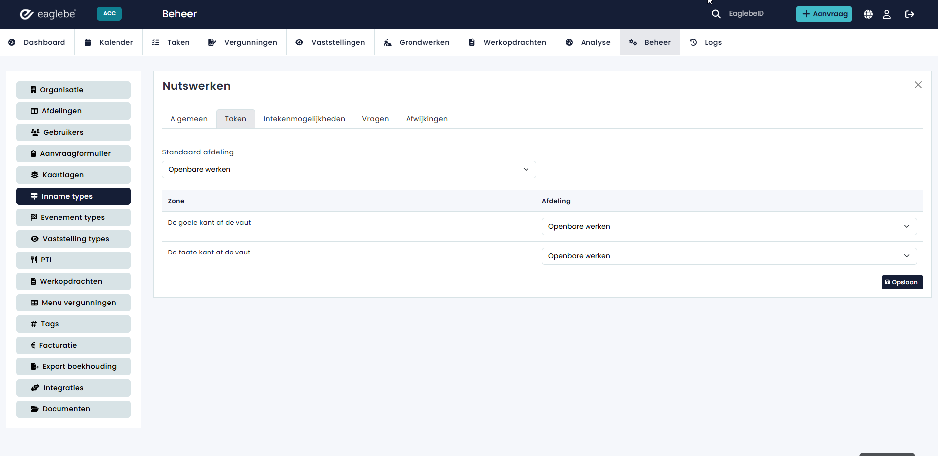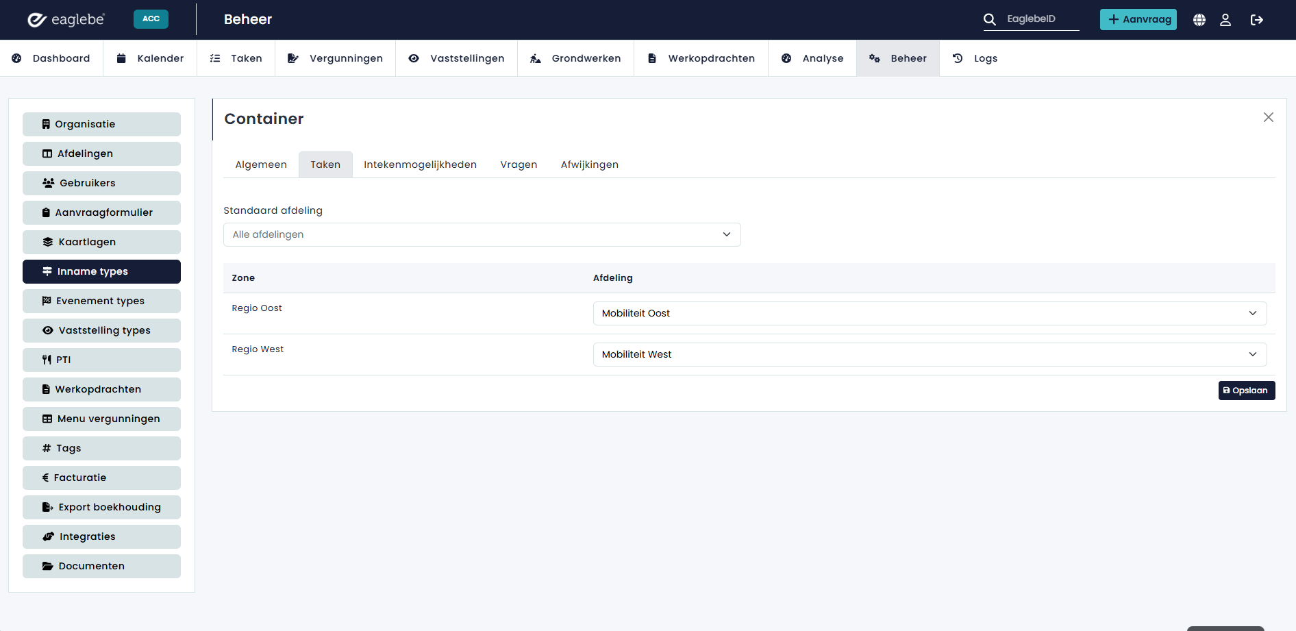 Per inname/evenement type kan je de verantwoordelijke afdeling instellen per regio. Hiervoor ga je naar het menu 'Beheer - Inname/Evenement types' en voeg je een nieuw type toe of bewerk je een bestaandt type. De taaktoewijzing verloopt via het tabblad 'Taken'.