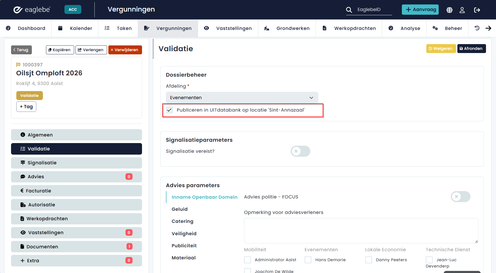 Indien de organisator bij zijn aanvraag ervoor heeft gekozen om de aanvraag niet te publiceren binnen de UITdatabank kan je dit (op vraag van de organisator) toch nog publiceren via de backoffice. Hiervoor kan je de vraag zelf aanpassen binnen het aanvraagformulier of kan je de checkbox aanduiden tijdens de Validatie van het dossier.