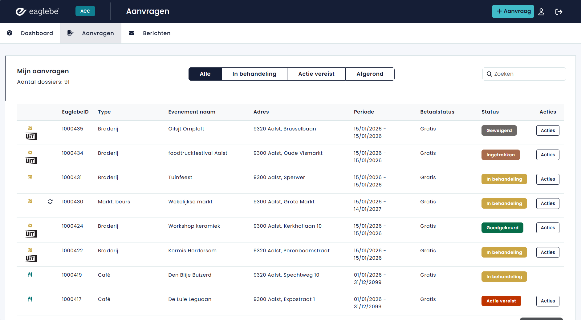 Eens een evenement werd gepubliceerd binnen de UITdatabank is dit ook zichtbaar voor de organisator binnen zijn Eaglebe Portaal. Ieder gesynct evenement wordt aangeduid met een UIT-logo naast het evenement logo in het overzicht van de aanvragen.