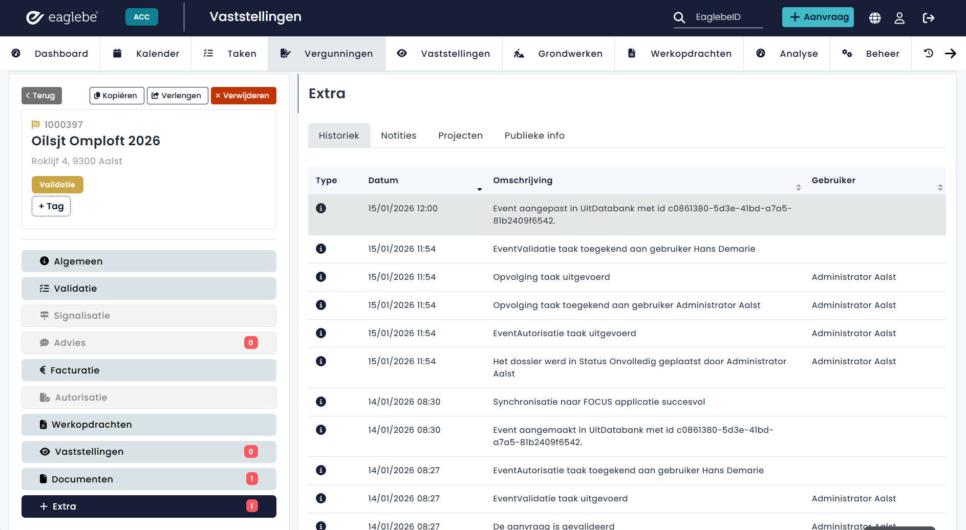 Wanneer een Eaglebe evenement wordt aangemaakt of aangepast binnen de UITdatabank wordt er altijd een log weggeschreven binnen de historiek van het dossier.