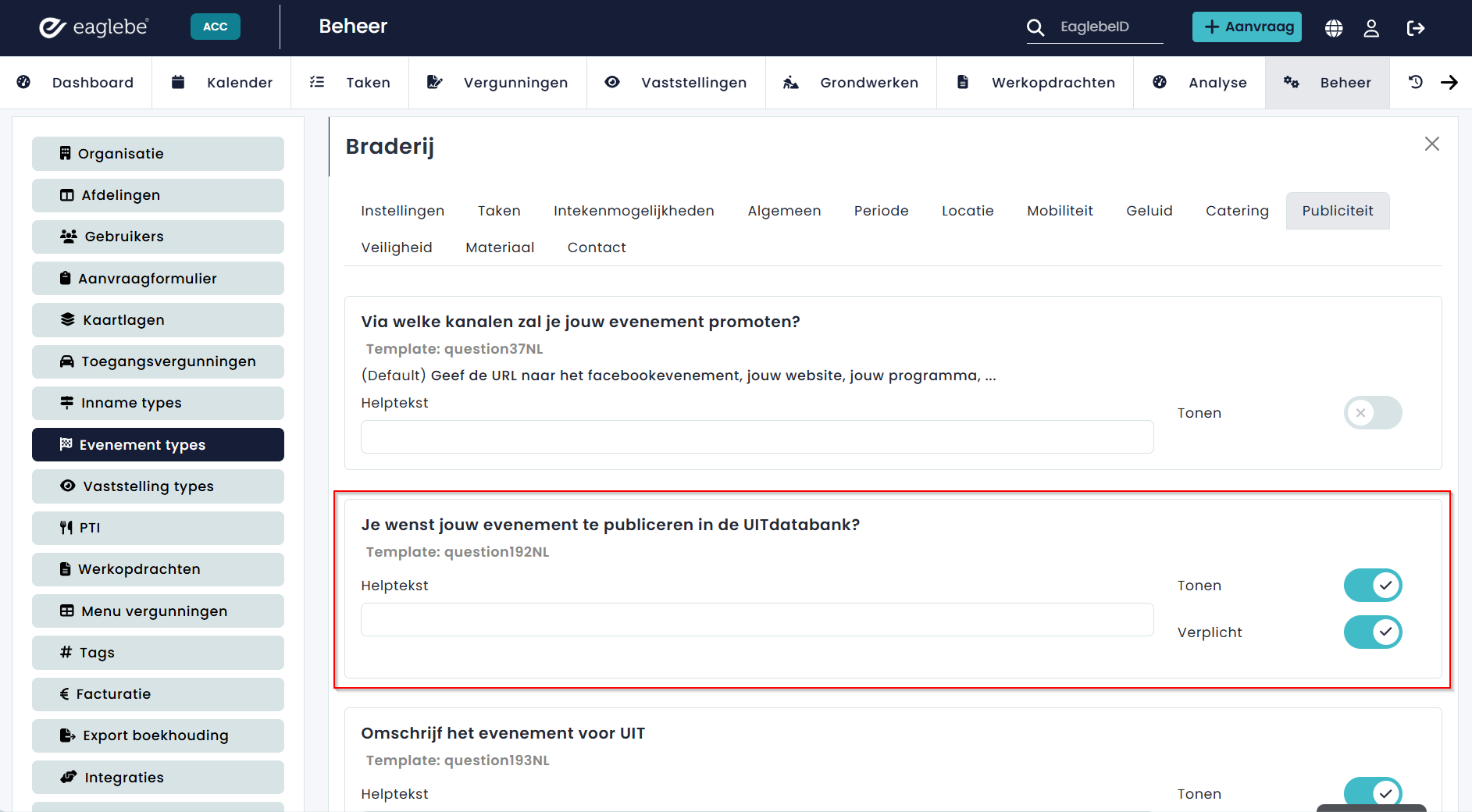 Hier kan je de vragenlijst voor ieder evenement type wijzigen via de knop Bewerken. De vraag voor de UITdatabank is te vinden onder de categorie 'Publiciteit. Je kan ervoor kiezen om de vraag optioneel te tonen of verplicht te maken. Indien gewenst kan je ook de onderstaande helptekst aanpassen.