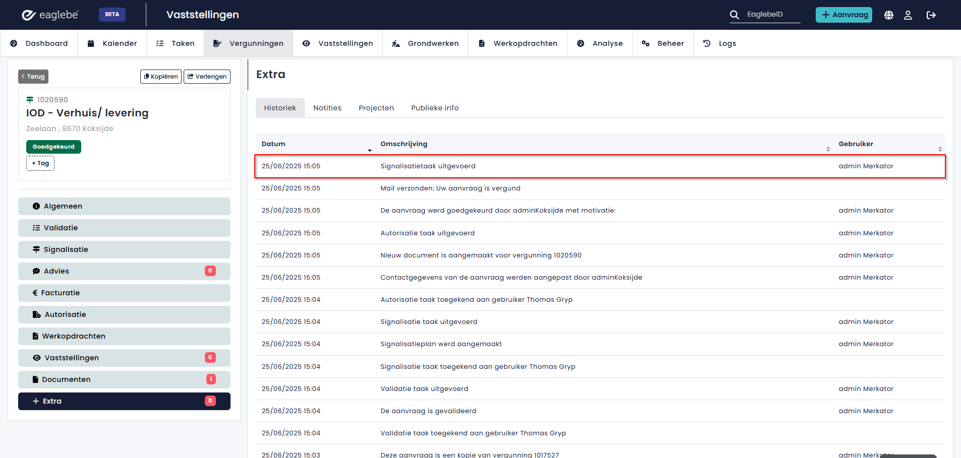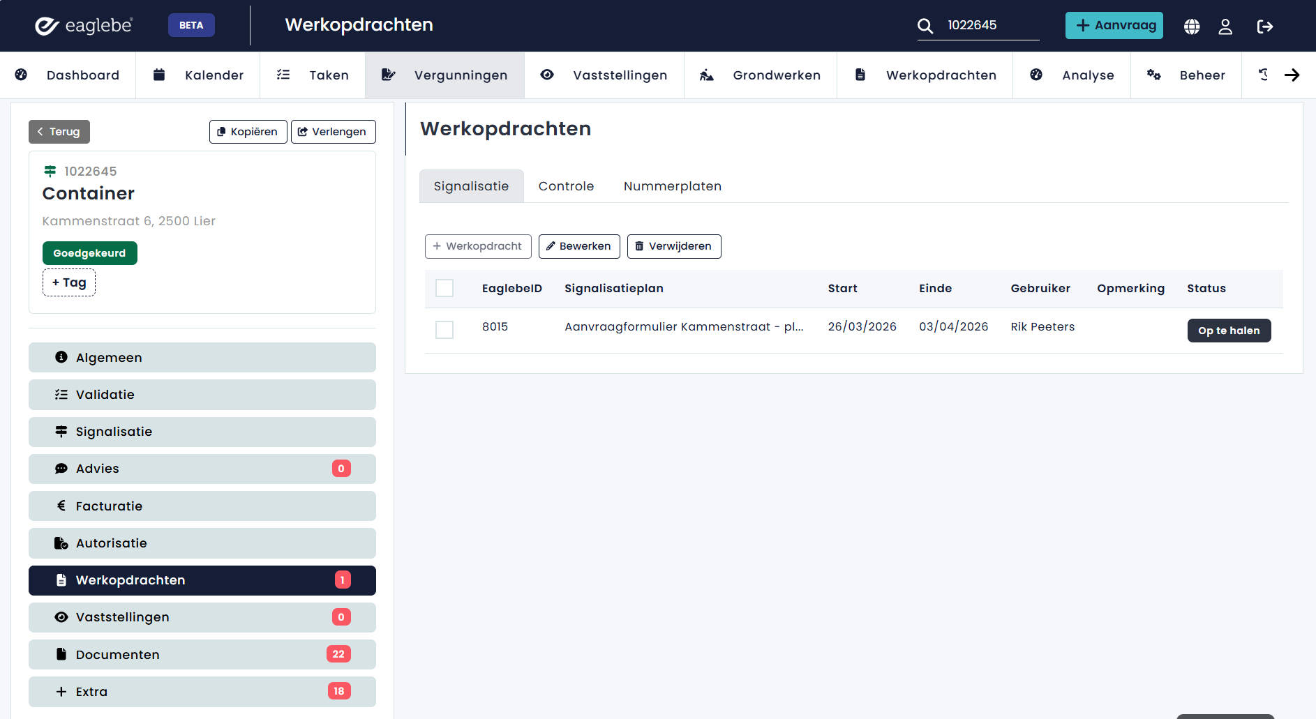 Wanneer werkopdrachten worden afgerond binnen Arinto, wordt de status van de werkopdrachten ook geupdate binnen Eaglebe. Je kan deze controleren binnen het dossier via het menu 'Werkopdrachten - Signalisatie'.