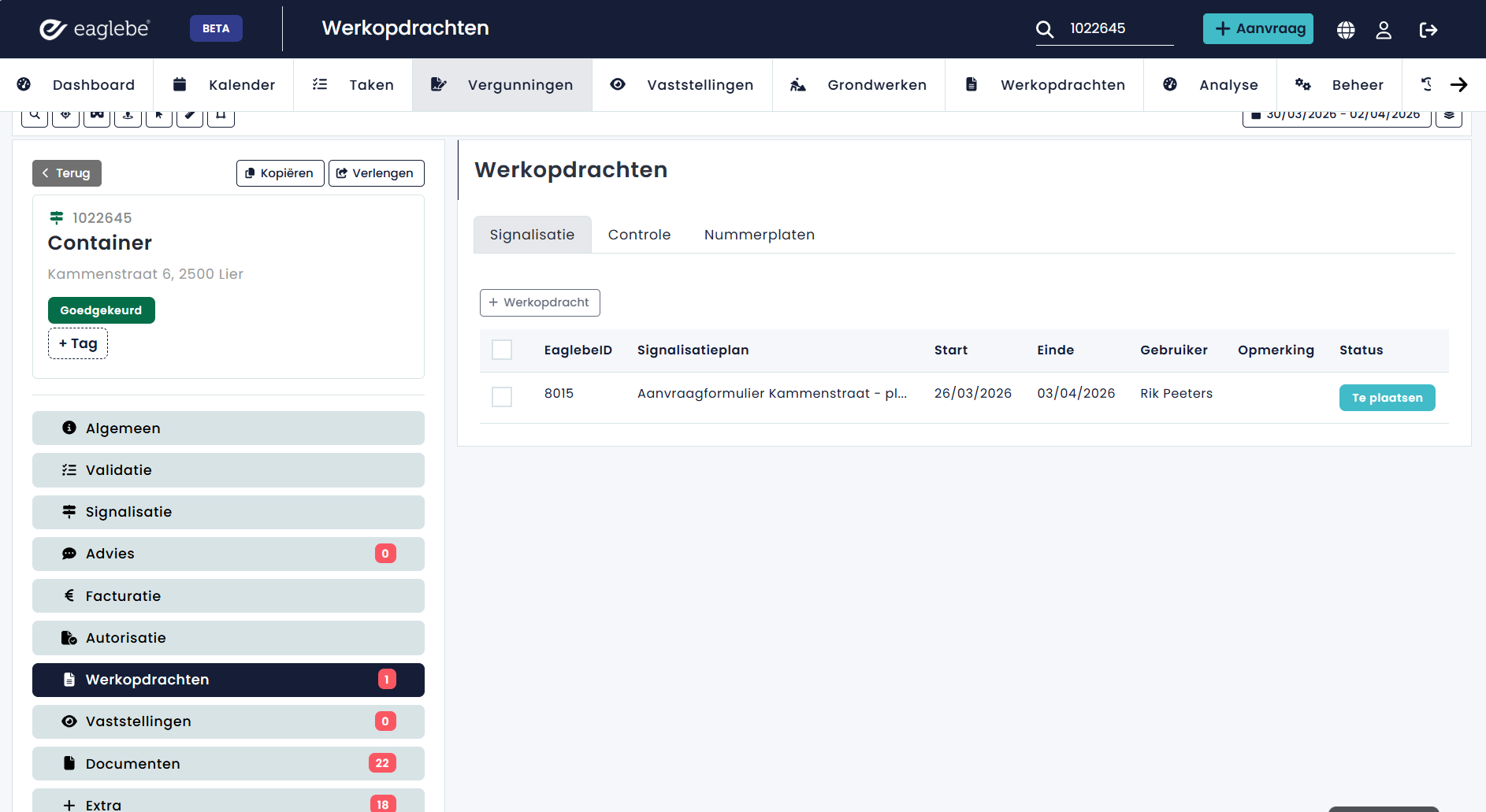 Tijdens de verwerking van een dossier zal Eaglebe automatisch werkopdrachten aanmaken op basis van de dossiergegevens en het ingetekende signalisatieplan. Met de integratie tussen Eaglebe en Arinto, stromen deze werkopdrachten automatisch door vanuit Eaglebe naar Arinto zodat de uitvoerende dienst deze vlot kan verwerken via hun eigen systeem.