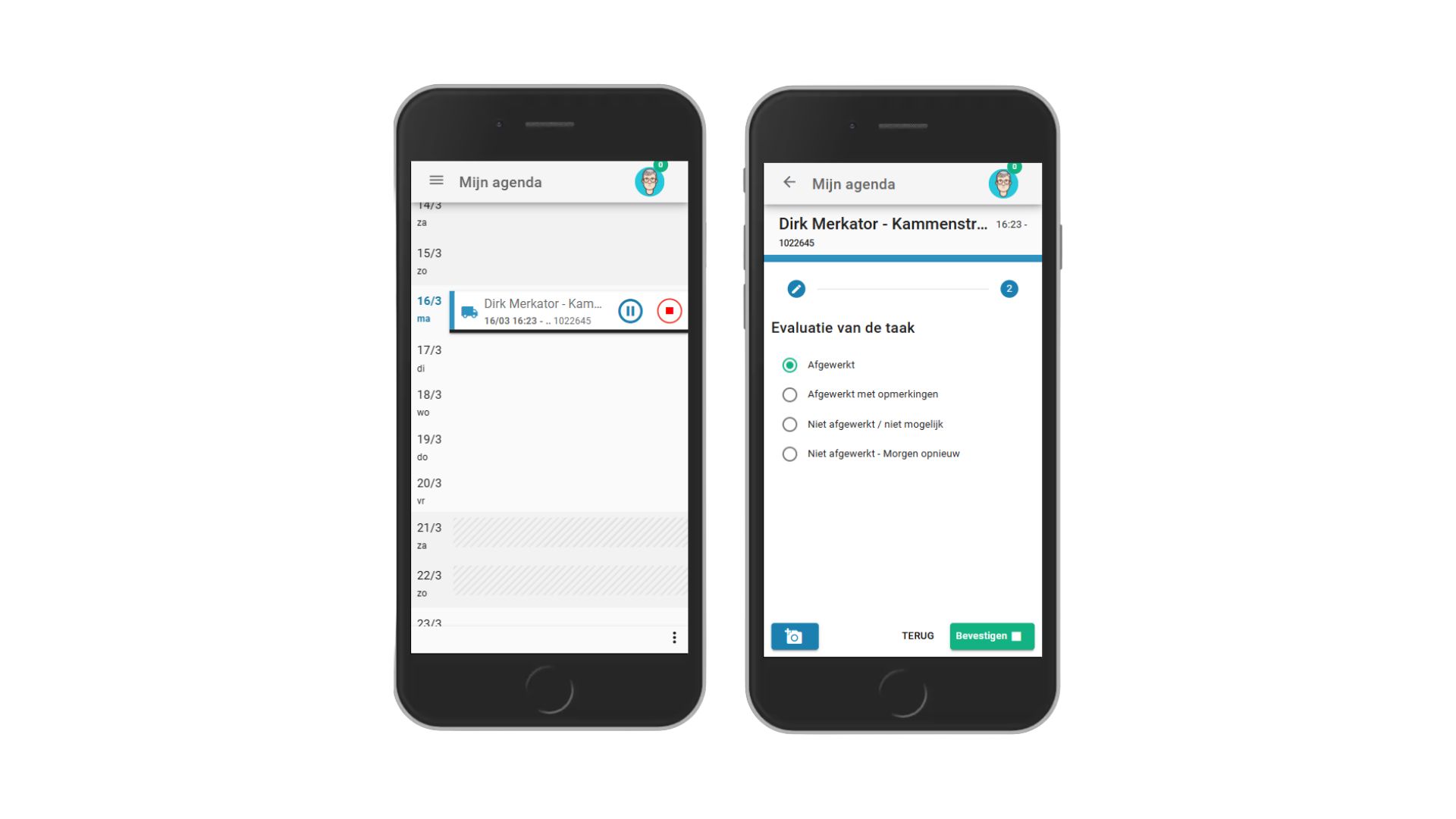 Door te klikken op het stop icoon in de agenda beëindig je de taak. Hierbij kan je aangeven of de taak succesvol werd uitgevoerd en kan je eventueel afbeeldingen toevoegen van de plaatsing.