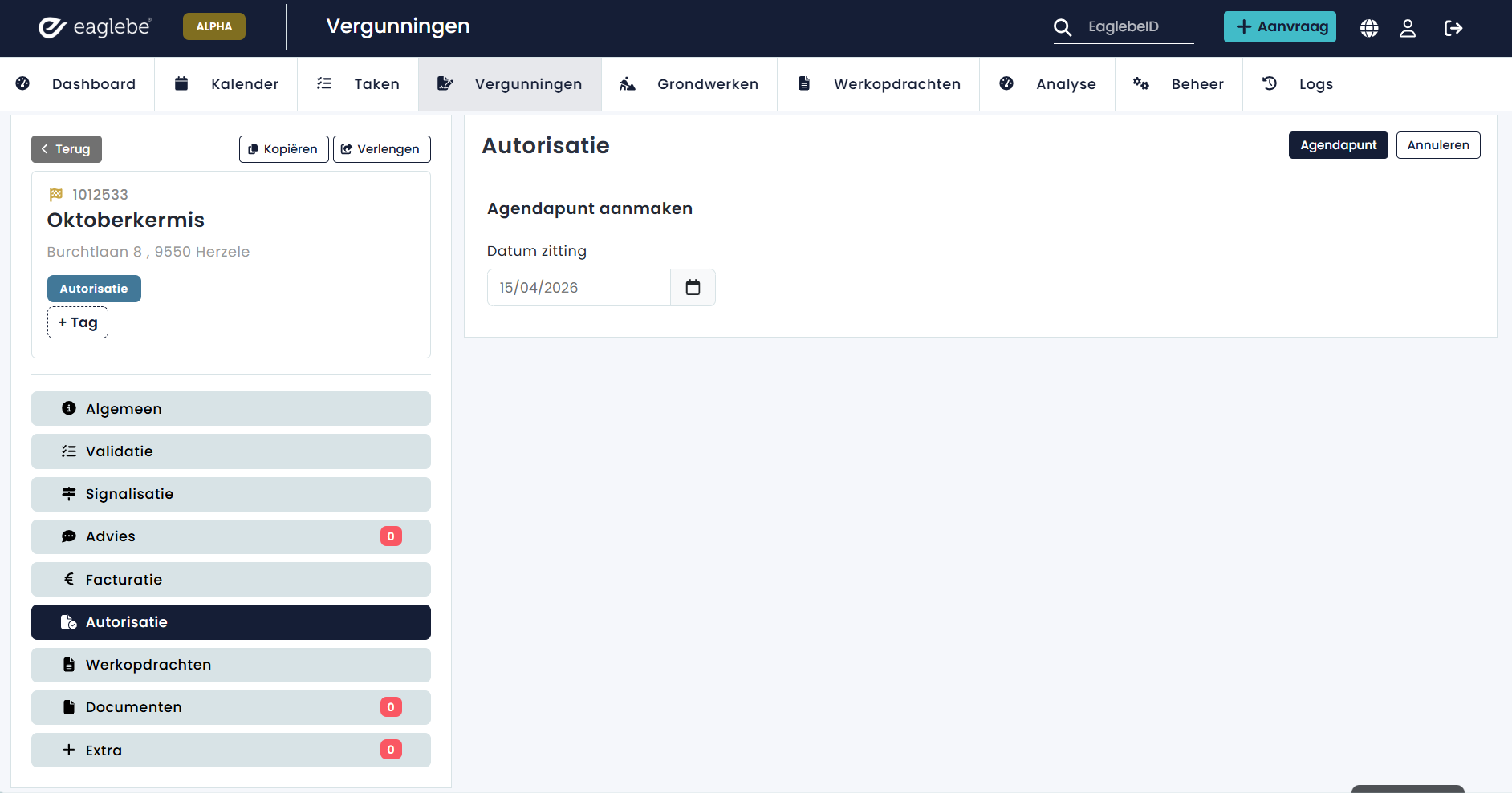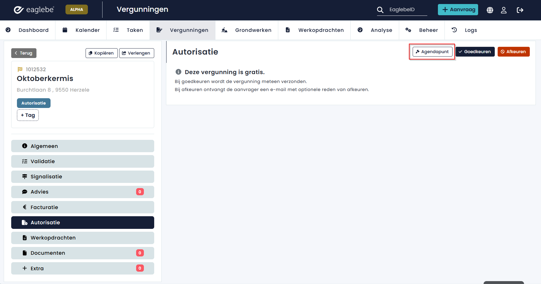 Een Eaglebe dossier kan pas geagendeerd worden wanneer dit volledig is verwerkt en zich in status Autorisatie bevindt (net voor goed- of afkeuren). Om een dossier te agenderen open je het dossier en ga je naar het menu Autorisatie. Daar heb je de keuze om, in plaats van het dossier meteen goed of af te keuren, dit eerst te agenderen via de knop 'Agendapunt'.