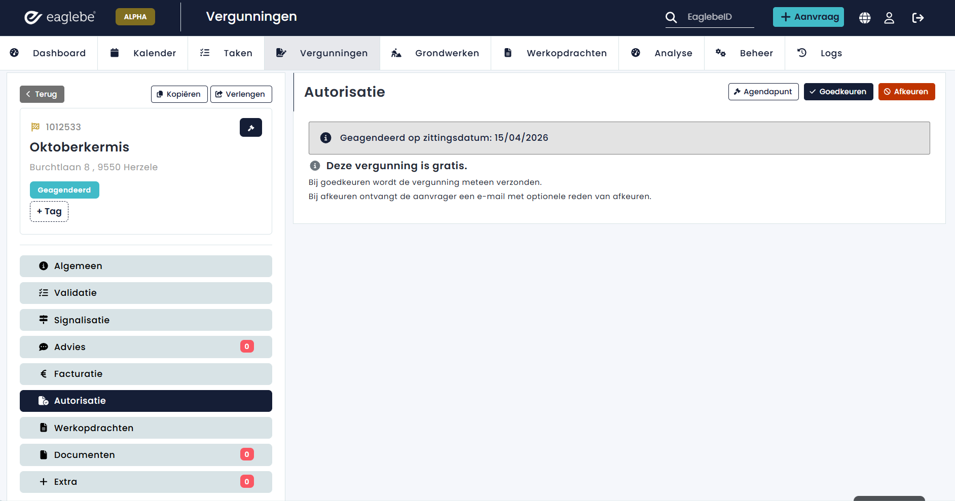 Eens de zittingsdatum voorbij is (workflow zonder integratie) of de beslissing werd geregistreerd (workflow met integratie) gaat het Eaglebe dossier opnieuw over naar de status Autorisatie. Het is dan klaar om finaal goed of af te keuren volgens de standaard flow. Hierbij kunnen de nodige vergunning en beslissingen worden meegestuurd.