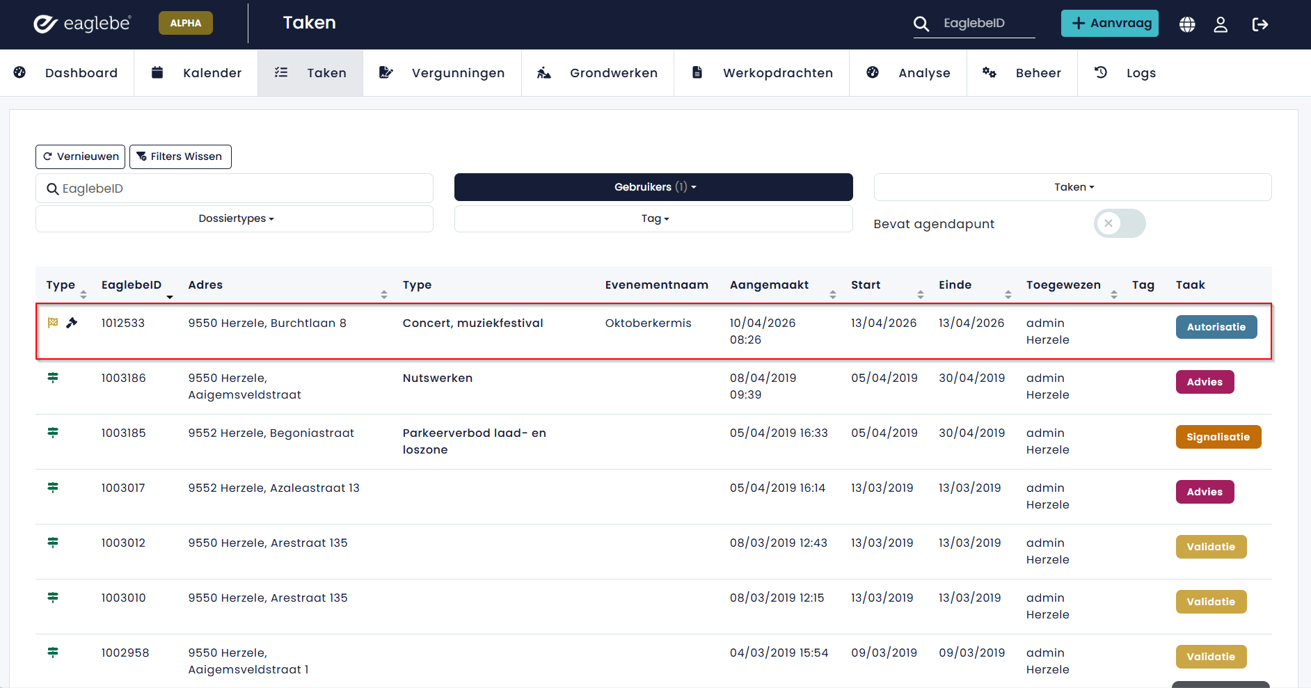 Een dossier in de status Geagendeerd bevindt zich in een soort van wacht status binnen Eaglebe. Er moet in deze status immers geen handeling worden uitgevoerd binnen het Eaglebe platform. Dit is eerder een indicatie dat het dossier op de agenda werd geplaatst en wacht op de beslissing van het college of andere instantie. De autorisatie-taak blijft dus actief wanneer een dossier in de status 'Geagendeerd' staat.